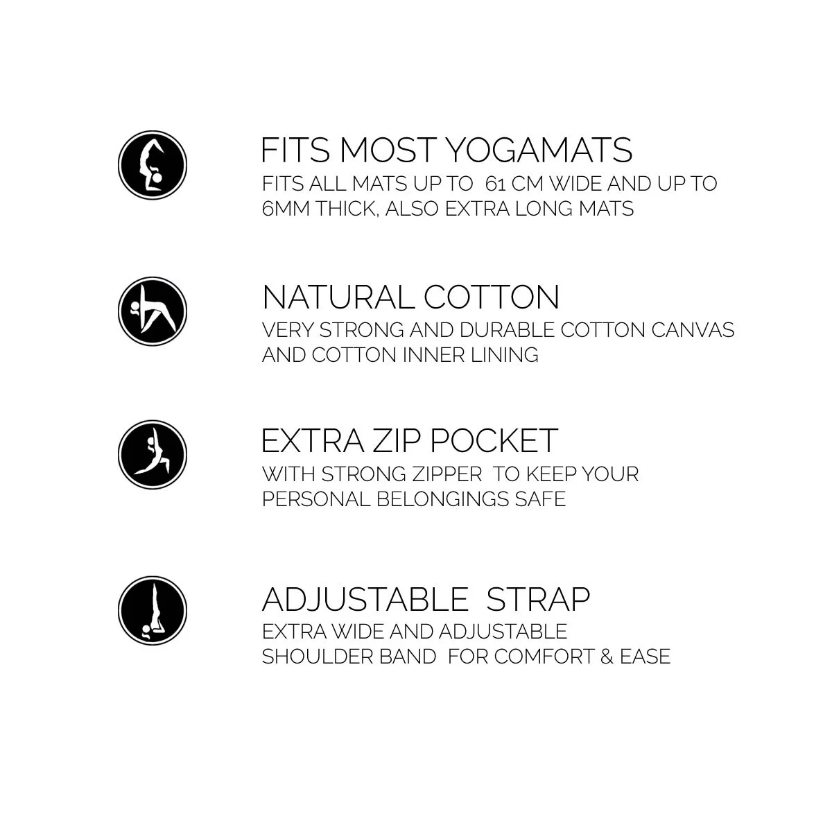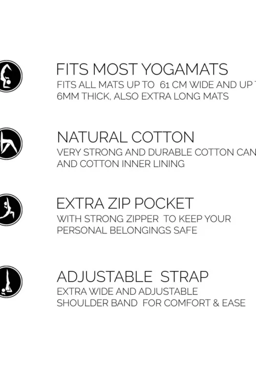- Vhodné pre štandardné podložky na jogu, extra hrubé a dlhé podložky a podložky do šírky 66 cm
