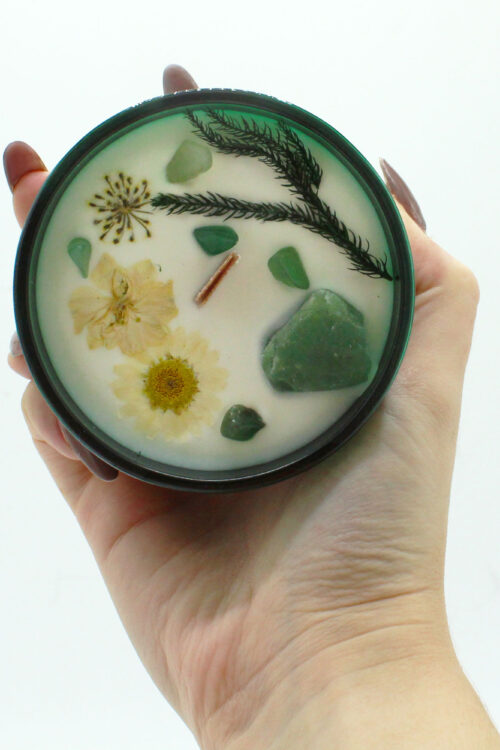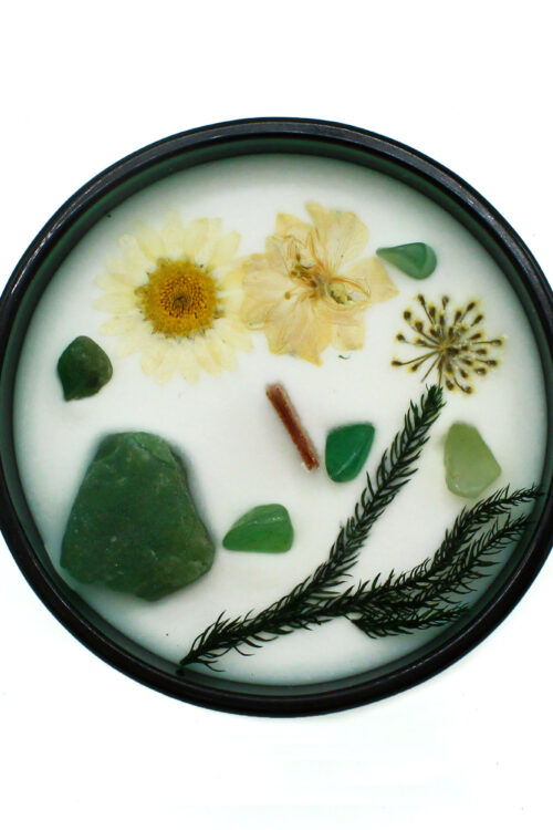 Materiál: sklenená dóza, sójový vosk, vôňa, polodrahokamy, sušené kvety.