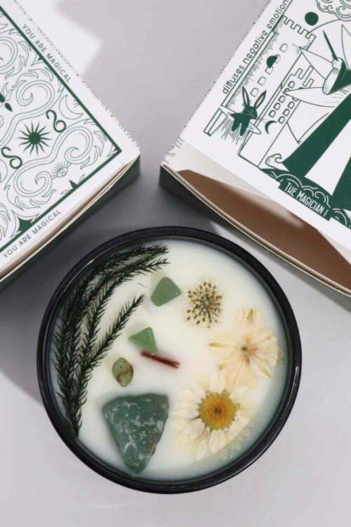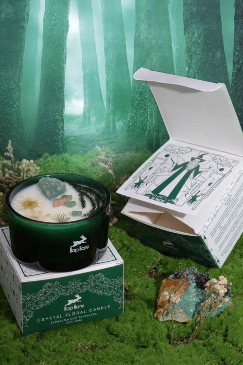 Vstúpte do mystického sveta s kryštálovou sviečkou s magickými kvetmi Hop Hare – The Magician, ktorá je vyrobená z drahokamu Jade a jemných suchých kvetov. Sviečka je doplnená tarotovou kartou (v krabičke), odhaľuje podmanivý príbeh v osviežujúcom objatí Enchanted Mint. Ponorte sa do kúzla premeny a botanickej elegancie s touto očarujúcou sviečkou. aždá sviečka rozpráva svoj vlastný príbeh, ktorý si môžete prečítať na krabičke sviečok.