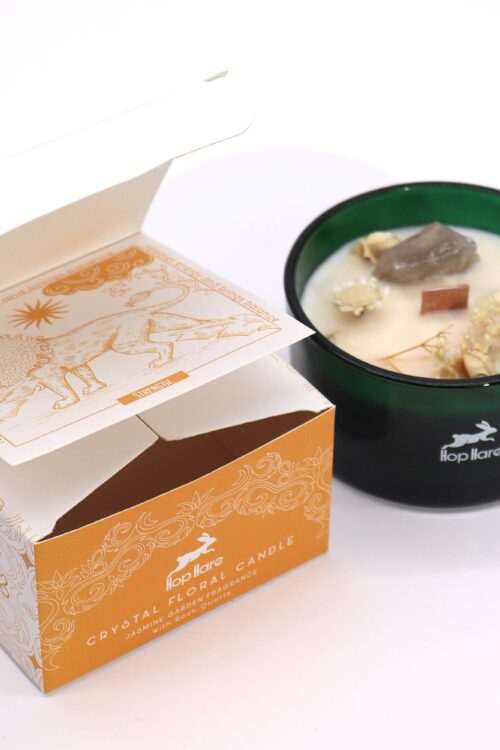 Vstúpte do mystického sveta s kryštálovou sviečkou Hop Hare – The Lion, Každá sviečka ukrýva tarotovú kartu, vyrobenou z kremeňa a sušených kvetov, ktorá odhaľuje podmanivý príbeh v rámci opulentnej vône Jasmine Garden. Ponorte sa do kúzla premeny a botanickej elegancie s touto očarujúcou sviečkou. Každá sviečka rozpráva svoj vlastný príbeh, ktorý si môžete prečítať na krabičke sviečok.