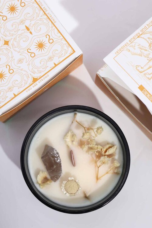 Materiál: sklenená dóza, sójový vosk, vôňa, polodrahokamy, sušené kvety.