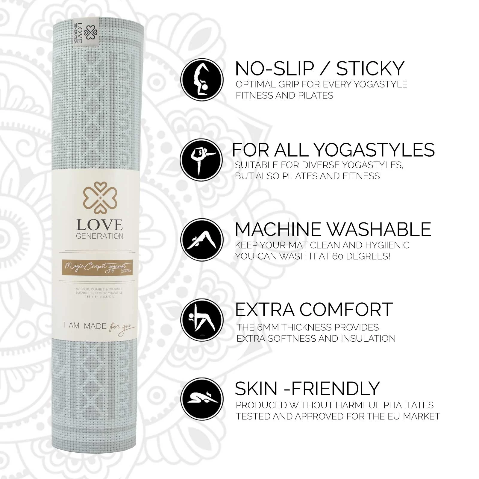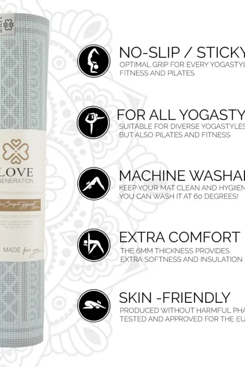 - Tlmenie – Love Generation vyvinula túto hrubú podložku na jogu pre extra tlmenie. Na vašej novej podložke sa preto budete cítiť príjemne a poskytne komfort pre citlivé kĺby. Extra príjemné, pokiaľ cvičíte na studenej podlahe. Pri záverečnej relaxácii si všimnete, že sa naozaj cítite pohodlne.