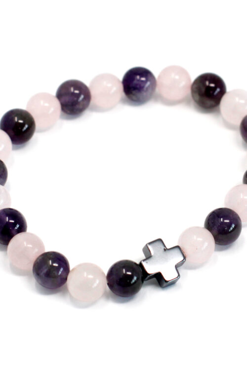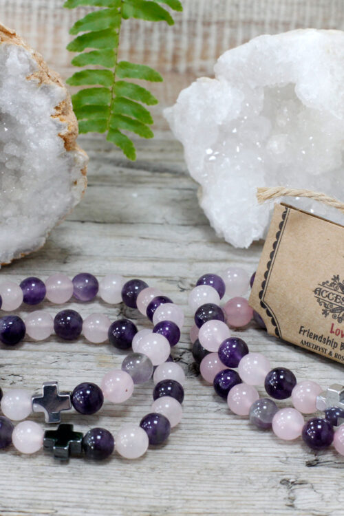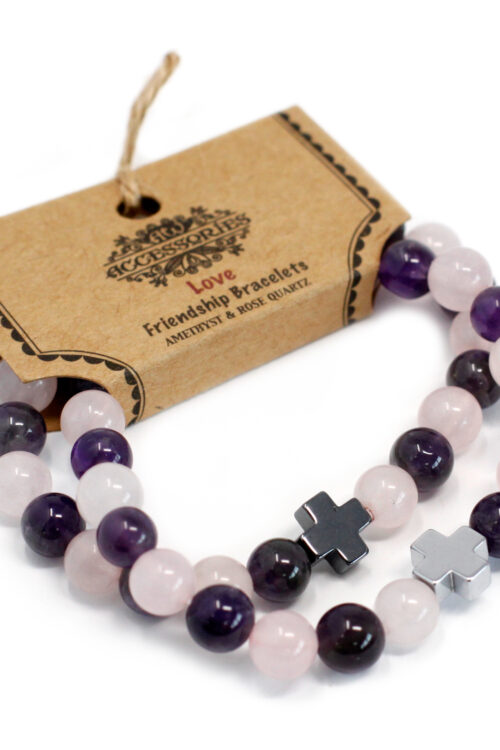 Sada 2 náramkov priateľstva z polodrahokamov môže byť úžasným darčekom. Na výber sú viaceré sady, z ktorých každá symbolizuje typ vzťahu. Táto sada je vytvorená z polodrahokamov Ametyst a Ruženín.